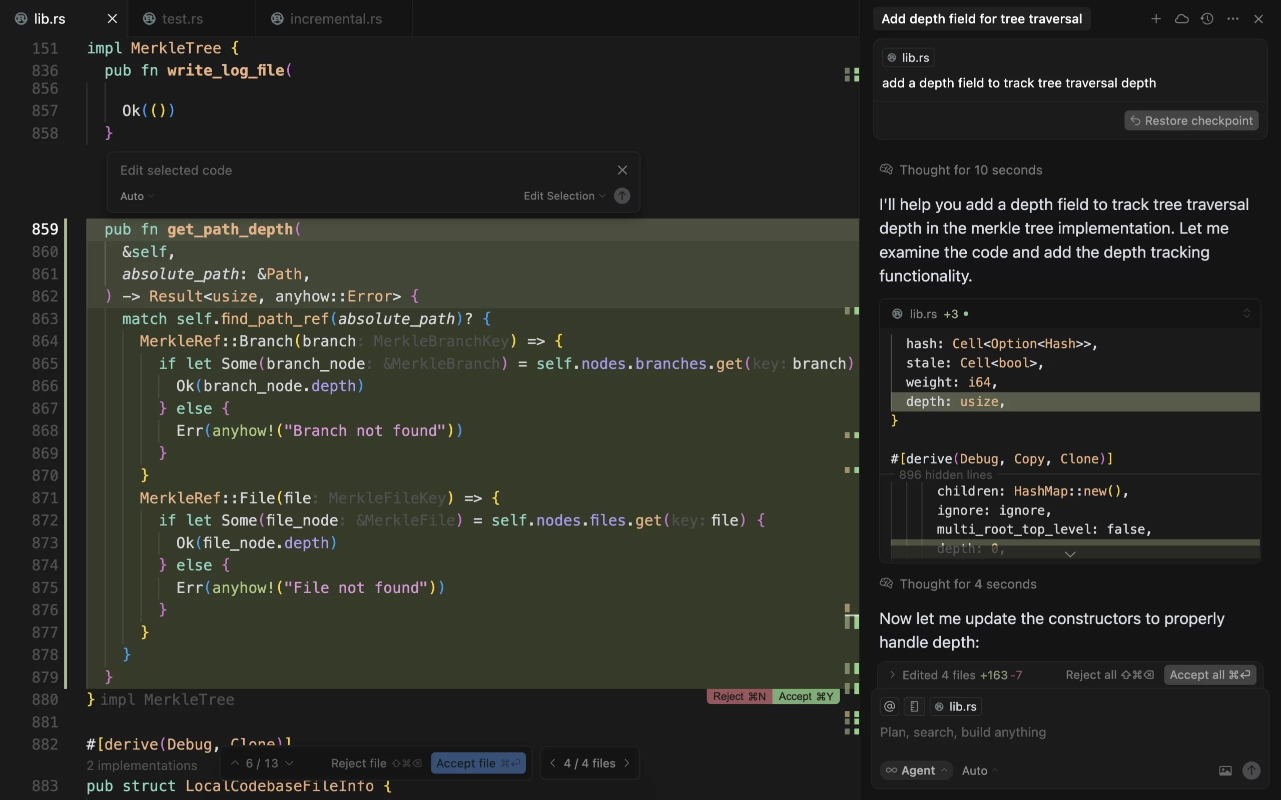 ファイル全体や特定のコードコンテキストを理解したチャット機能を搭載。提案は即時にコードへ反映できます。